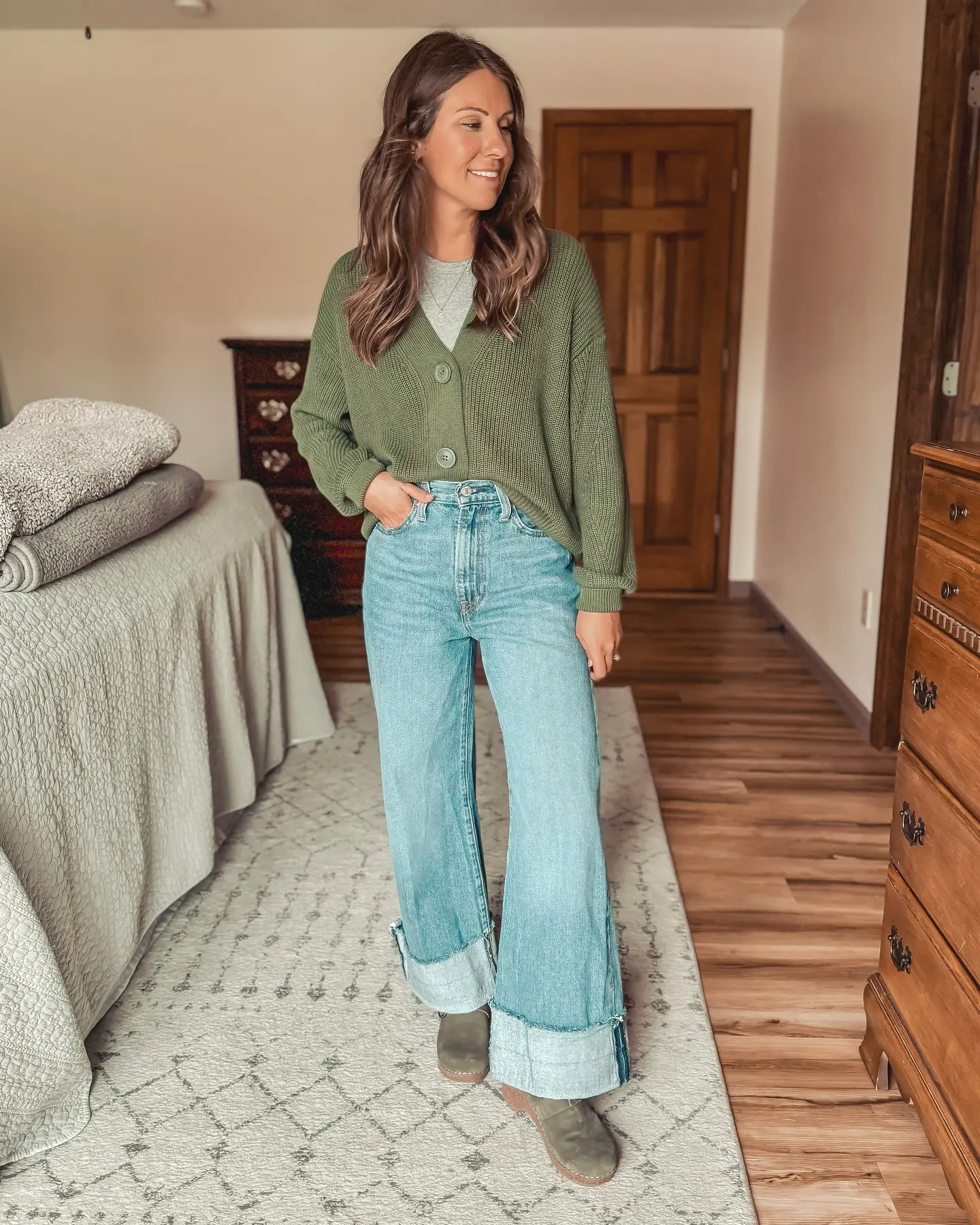 Proportion Play: This is where understanding balance becomes crucial. With volume on both top (cardigan) and bottom (wide leg jeans), you need definition somewhere—hence the fitted top underneath. This creates visual interest through layering while maintaining a flattering silhouette.