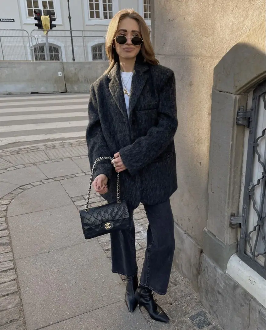 Dark jeans keep the look streamlined, and leather ankle boots offer both style and traction for snowy sidewalks. A structured tote holds your portfolio and essentials while maintaining the polished vibe. This outfit works beautifully for corporate environments and traditional industries!