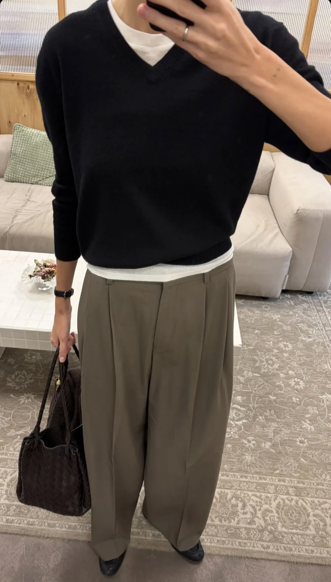 4. turtleneck + wide-leg trousers + long cardigan + pointed-toe flats + leather satchel