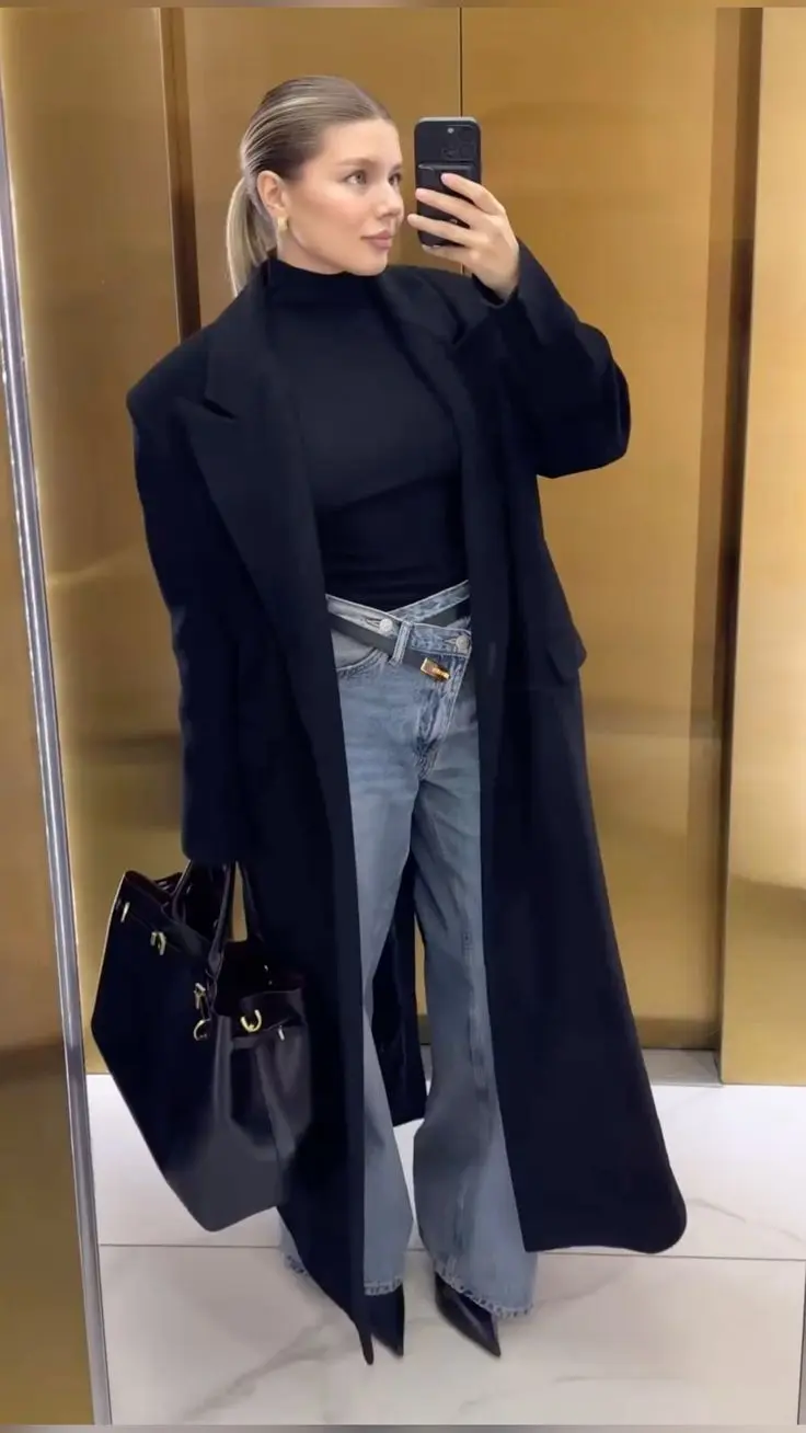 6. blue jeans flare+ black turtleneck+ boots+ wool coat