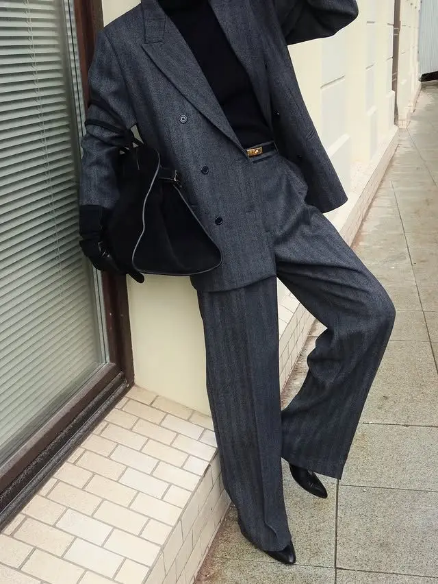 Sometimes you need to bring your A-game! This outfit takes the traditional suit and makes it winter-appropriate by swapping the blouse for a cashmere turtleneck. The result? You get the authority of a suit with the warmth and modern edge of knitwear.