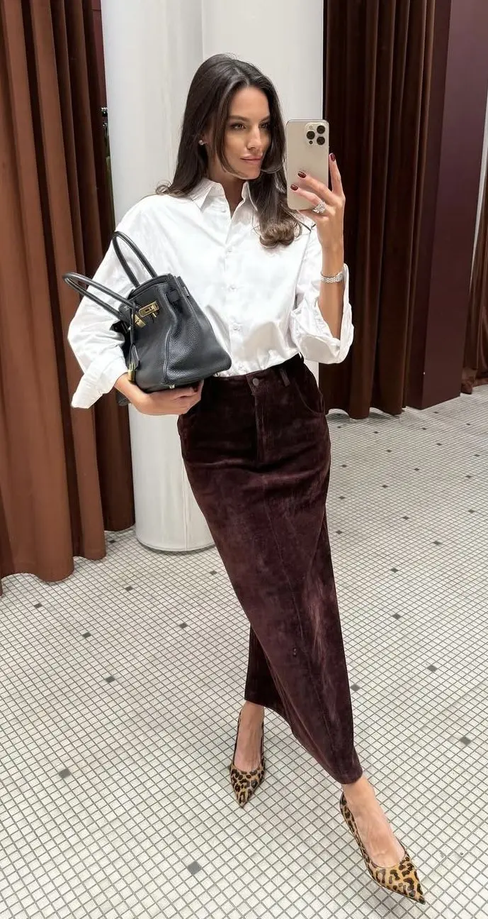 A suede pencil skirt is winter elegance personified! The texture adds richness and sophistication while the pencil silhouette keeps things classically professional. Pair it with a crisp white shirt for that timeless contrast that never fails to impress—it’s clean, confident, and shows you understand wardrobe fundamentals. The combination feels polished without trying too hard, which is exactly the vibe you want for an interview!