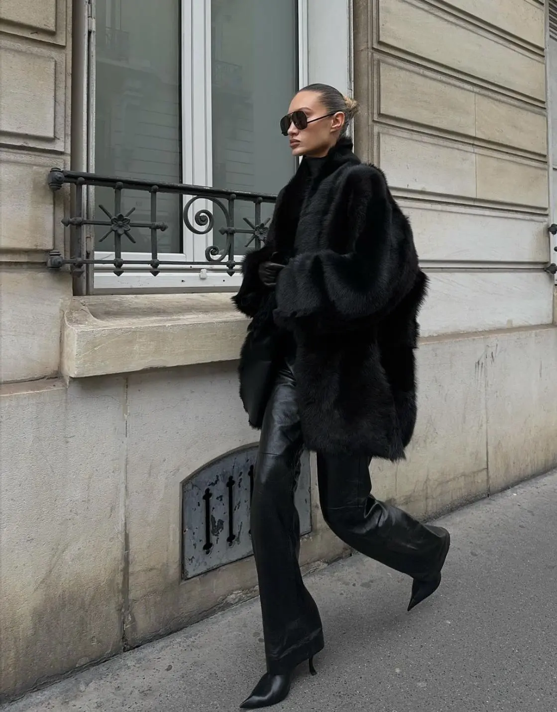 12. leather trousers-flare + fur coat + red shirt + boots