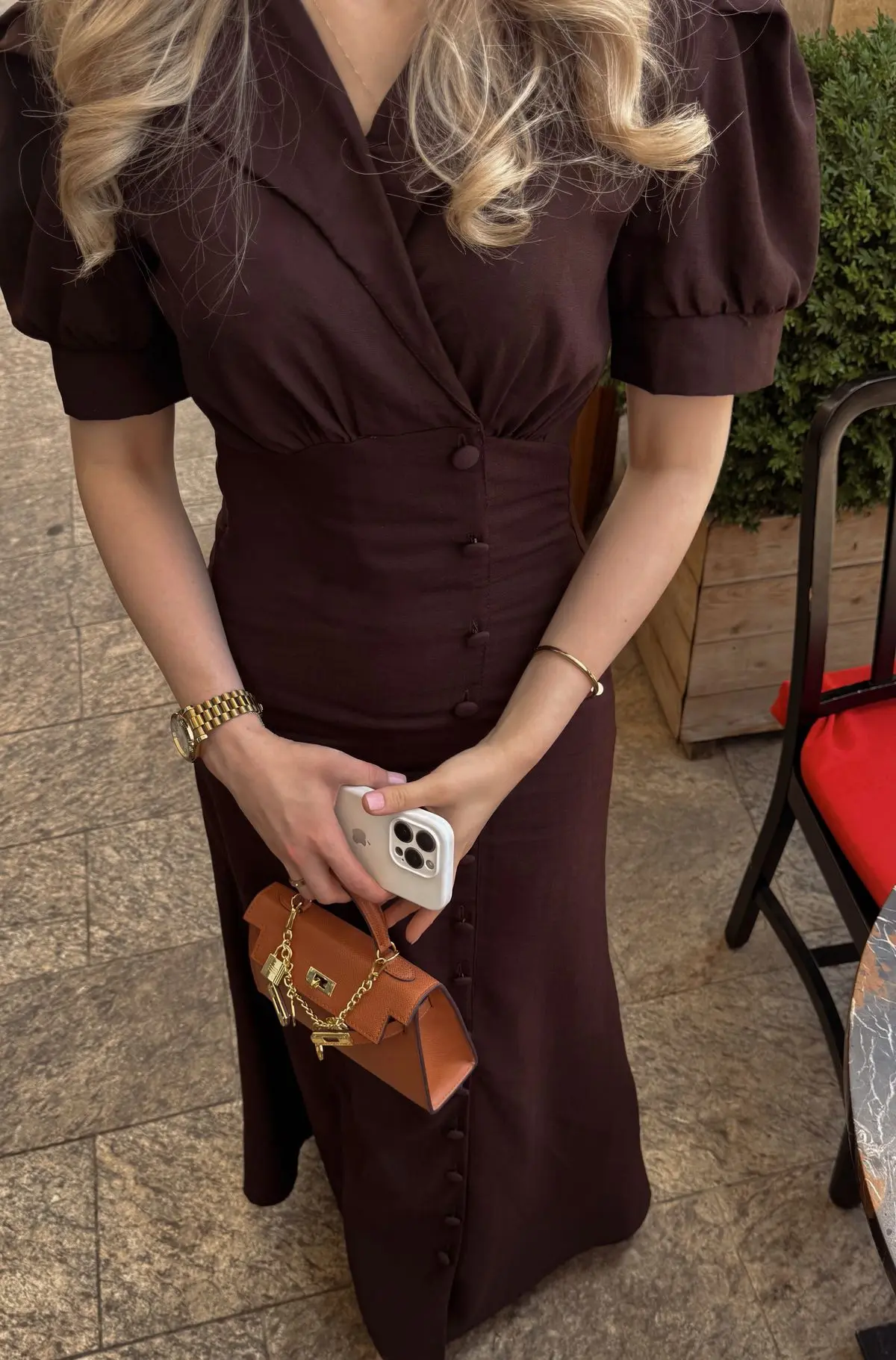 This rich brown dress is what I call “quiet luxury”—sophisticated without screaming for attention. The wrap-style bodice creates a universally flattering silhouette, while the puff sleeves add just enough visual interest without feeling costume-y. The button-front detail and matching belt define the waist beautifully, and the midi length hits at the most professional spot on your leg.