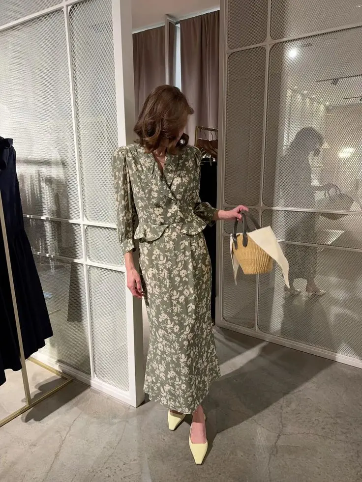 Styling Tip: The genius of a wrap dress is the adjustable fit—you can customize how fitted or relaxed you want it to feel throughout the day. The V-neckline is naturally flattering but professional when not wrapped too low. Those yellow pointed-toe heels are a brilliant choice—they pick up the lighter tones in the dress and add a modern pop of color. Keep jewelry minimal with this pattern—maybe small gold hoops and a simple watch. The wooden bag adds natural texture that complements the botanical print. This outfit is perfect for creative workplaces or Fridays when you want to feel a bit more playful.