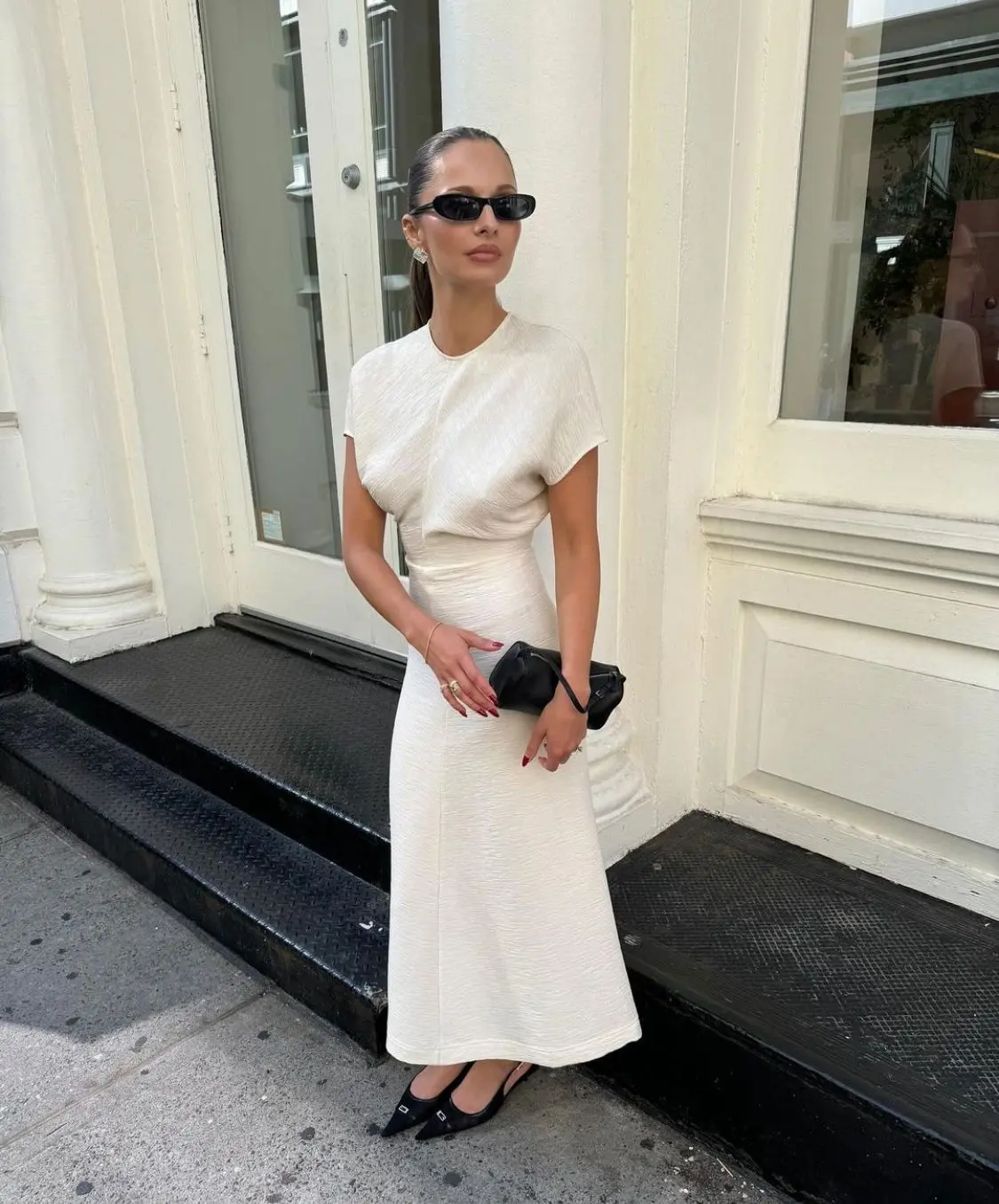 Styling Tip: White and ivory dresses can be tricky for the office (hello, potential coffee spills), but when you find the right one, it’s worth the risk. This style works because the texture camouflages minor imperfections and the structured fit looks intentional. The black accessories create a striking contrast—the clutch and pointed pumps with embellishments add just the right amount of edge to keep the look from feeling too bridal or bland. Sleek hair pulled back and modern sunglasses complete the polished aesthetic. This is perfect for spring and summer meetings, especially outdoor events or client lunches.