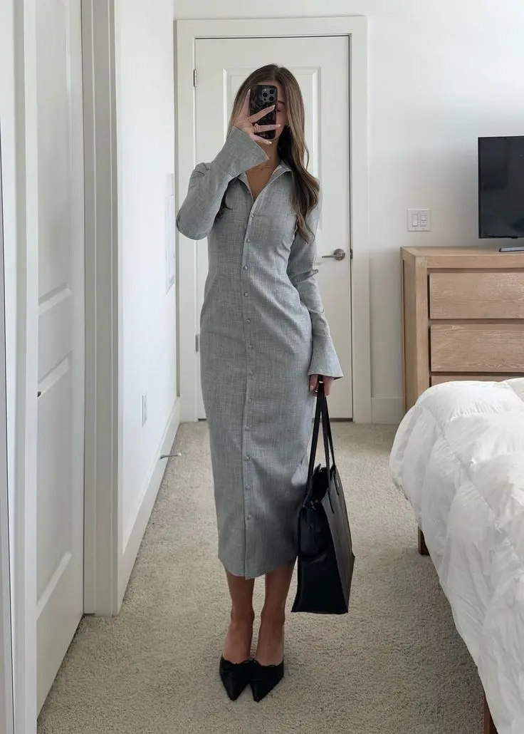 This grey shirt dress is the perfect example of how menswear-inspired pieces can be incredibly feminine and office-appropriate. The classic collar and button-front detail bring structure and professionalism, while the long sleeves with subtle flare at the cuffs add a graceful touch. The fitted silhouette through the bodice and midi length create a polished, put-together look that requires minimal styling effort.