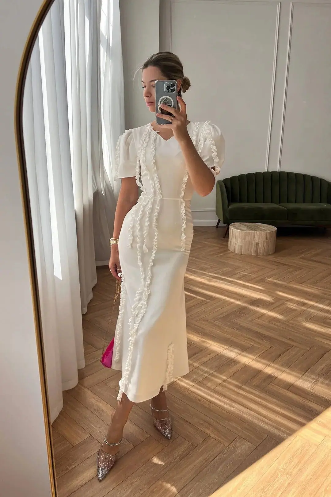 This white dress brings romantic details to a professional silhouette. The puff sleeves add vintage-inspired charm, while vertical ruffle trim creates a lengthening line down the front. The midi length and belted waist maintain structure and appropriateness for the workplace.