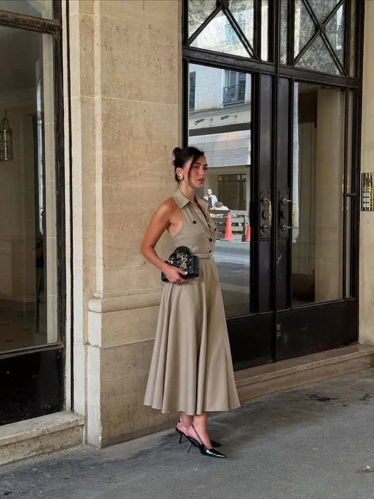 Styling Tip: When wearing a sleeveless dress to the office, keep a blazer or cardigan nearby—not just for warmth, but to have the option to adjust your look for different meetings. The beauty of this style is its versatility. Pair with black pumps and a structured bag for formal meetings, or black ballet flats and a brown bag (as shown) for a softer approach. Style your hair in a low bun and add delicate jewelry to complete the refined aesthetic. This is your go-to for days when you want to look effortlessly put-together.