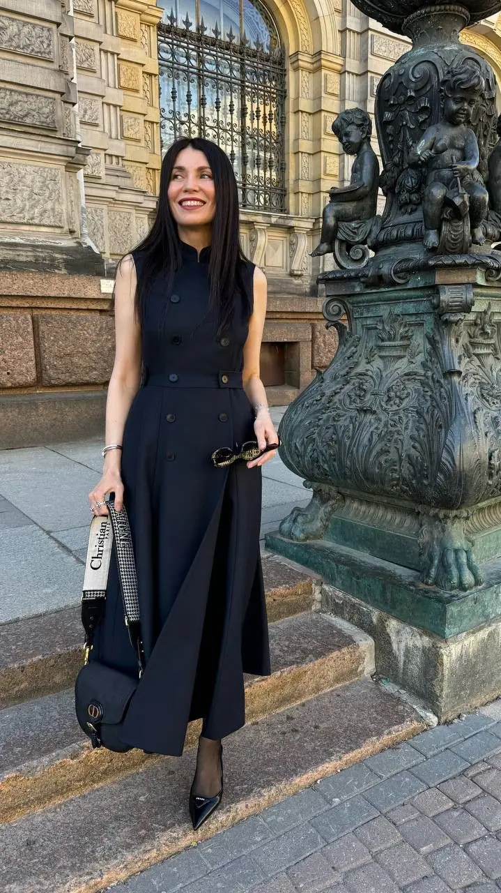 Styling Tip: Black dresses can sometimes feel too severe or formal, but this one strikes the perfect balance with its military-inspired buttons and softer silhouette. The key is in the accessories—add black patent pumps for a powerful look, or soften it with nude or brown shoes. A sleek low bun (as shown) emphasizes the dress’s clean lines. This is your power dress—wear it for important presentations, job interviews, or days when you need an extra confidence boost. The beauty is that it requires virtually no styling effort but delivers maximum impact.