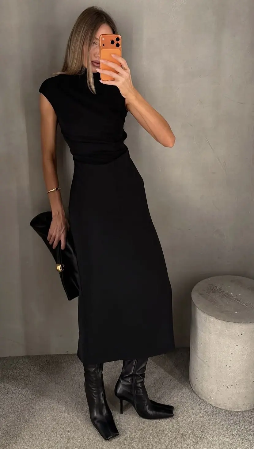 This sleek black midi dress with cap sleeves and a mock neck proves that simple can be seriously sophisticated. The body-skimming silhouette flatters without clinging, while the mock neck adds instant polish.
