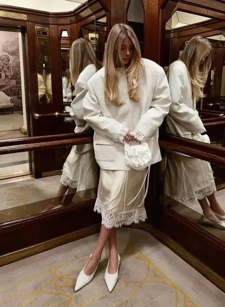 An oversized cream textured blazer paired with a champagne silk midi skirt featuring delicate lace trim and white pointed-toe heels creates an unexpectedly sophisticated combination. The ruched clutch bag adds texture while keeping the monochromatic aesthetic intact.