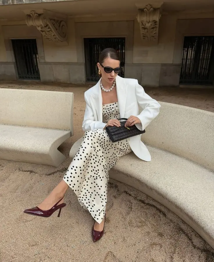 A cream and black polka dot midi dress paired with a crisp white oversized blazer, burgundy pointed-toe heels, and pearl necklace creates timeless elegance. The black quilted bag and cat-eye sunglasses complete the polished aesthetic.