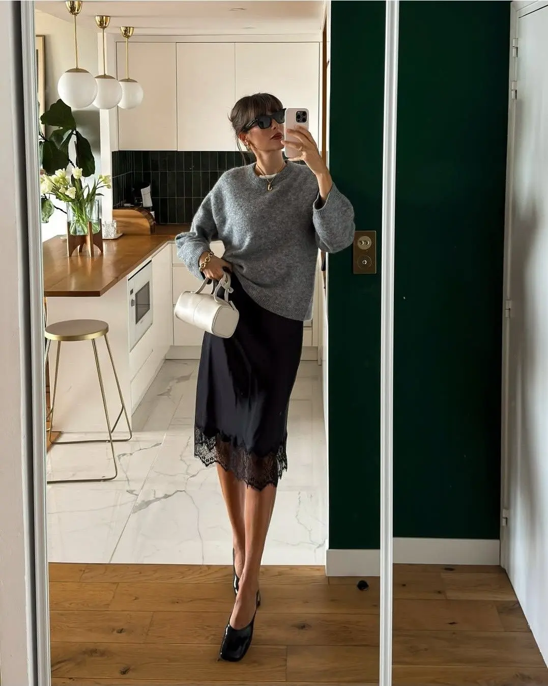 A charcoal grey cashmere sweater paired with a black silk slip skirt featuring lace hem detail creates the perfect blend of cozy and romantic. The oversized sunglasses and cream barrel bag keep it contemporary, while black mules add sophistication.