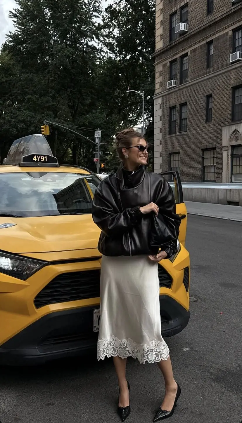 An oversized black leather bomber jacket paired with a cream slip skirt featuring romantic lace trim and black patent heels creates an edgy-meets-feminine aesthetic. The sleek low bun completes the polished look.