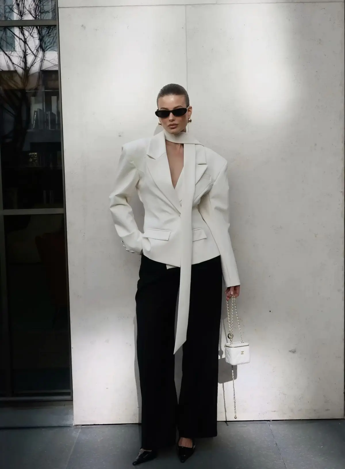 A structured white cropped blazer with padded shoulders paired with black wide-leg trousers, a sheer black turtleneck, and black pointed heels creates modern sophistication with an edge. The small white bag adds luxury.