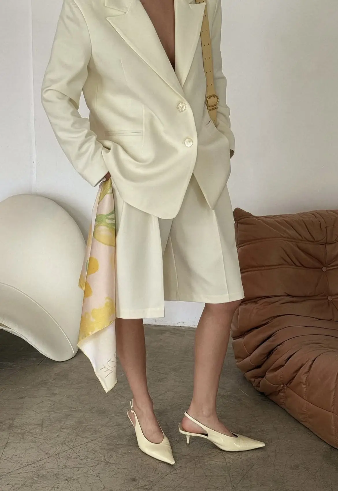 A cream oversized blazer paired with matching tailored shorts and cream slingback kitten heels creates unexpected sophistication. The silk scarf detail and designer bag add polish.