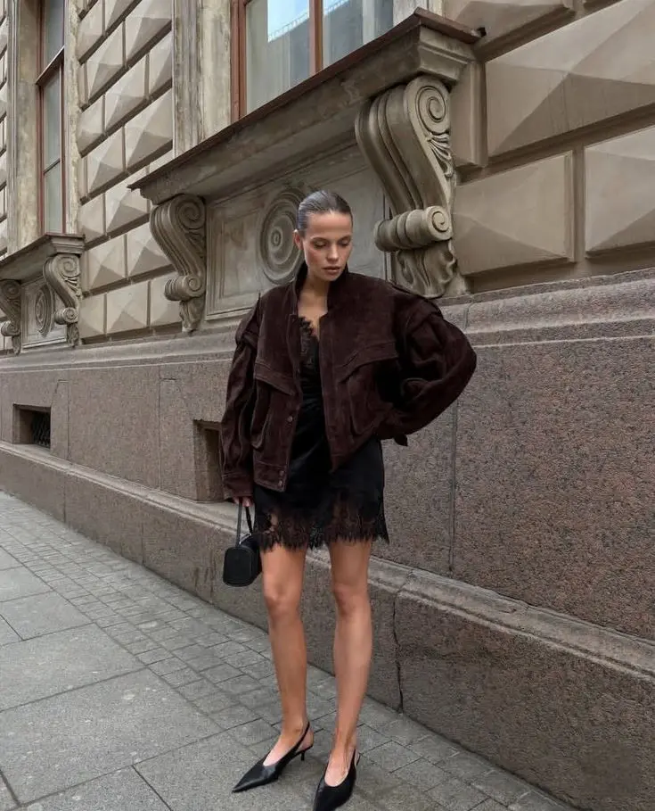 An oversized chocolate brown suede jacket paired with a black slip dress featuring lace trim and black kitten heel mules creates the perfect tough-meets-sweet aesthetic. The small black bag keeps it streamlined.