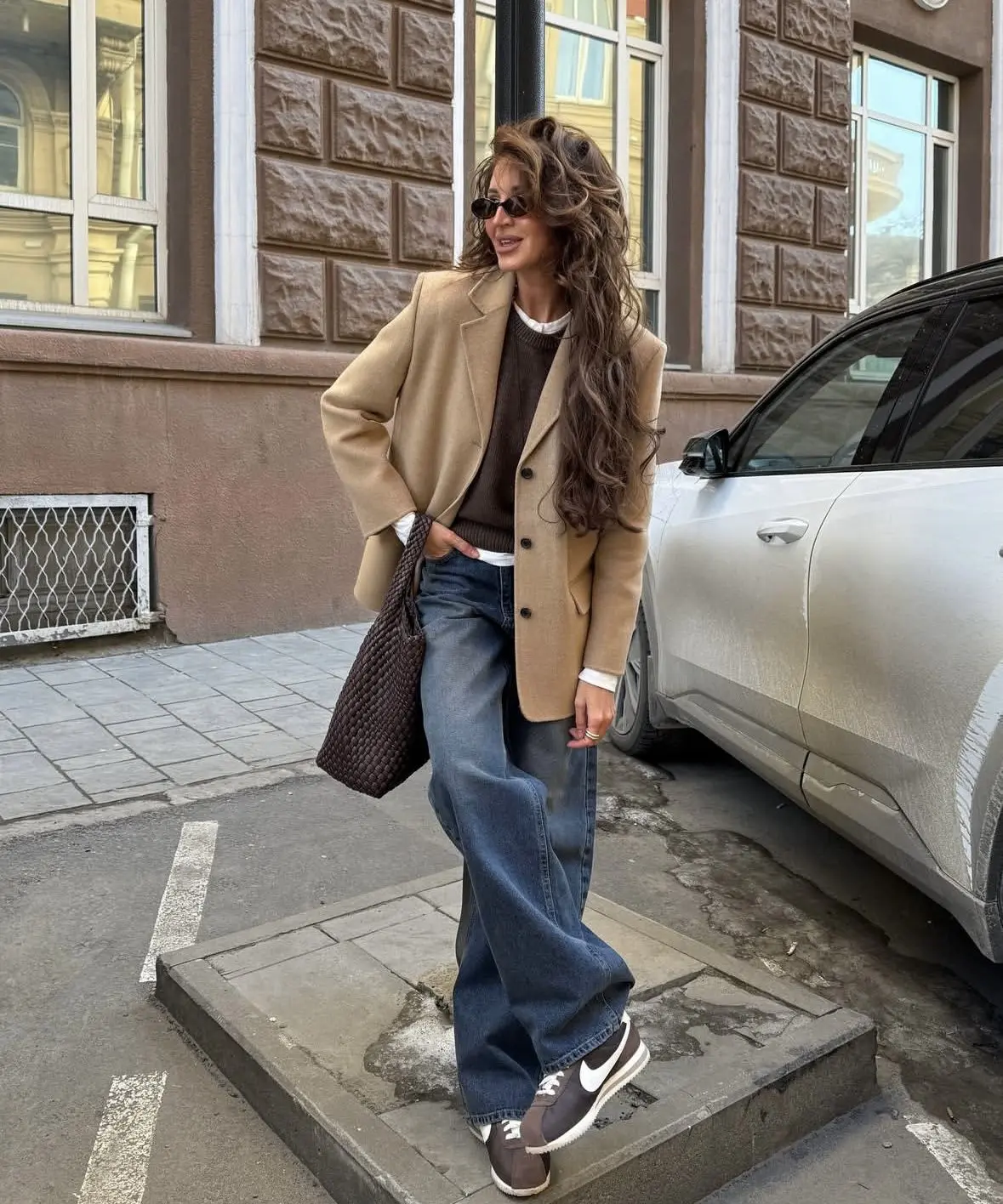 1. Oversized blazer + wide-leg jeans + sneakers Nike Cortez