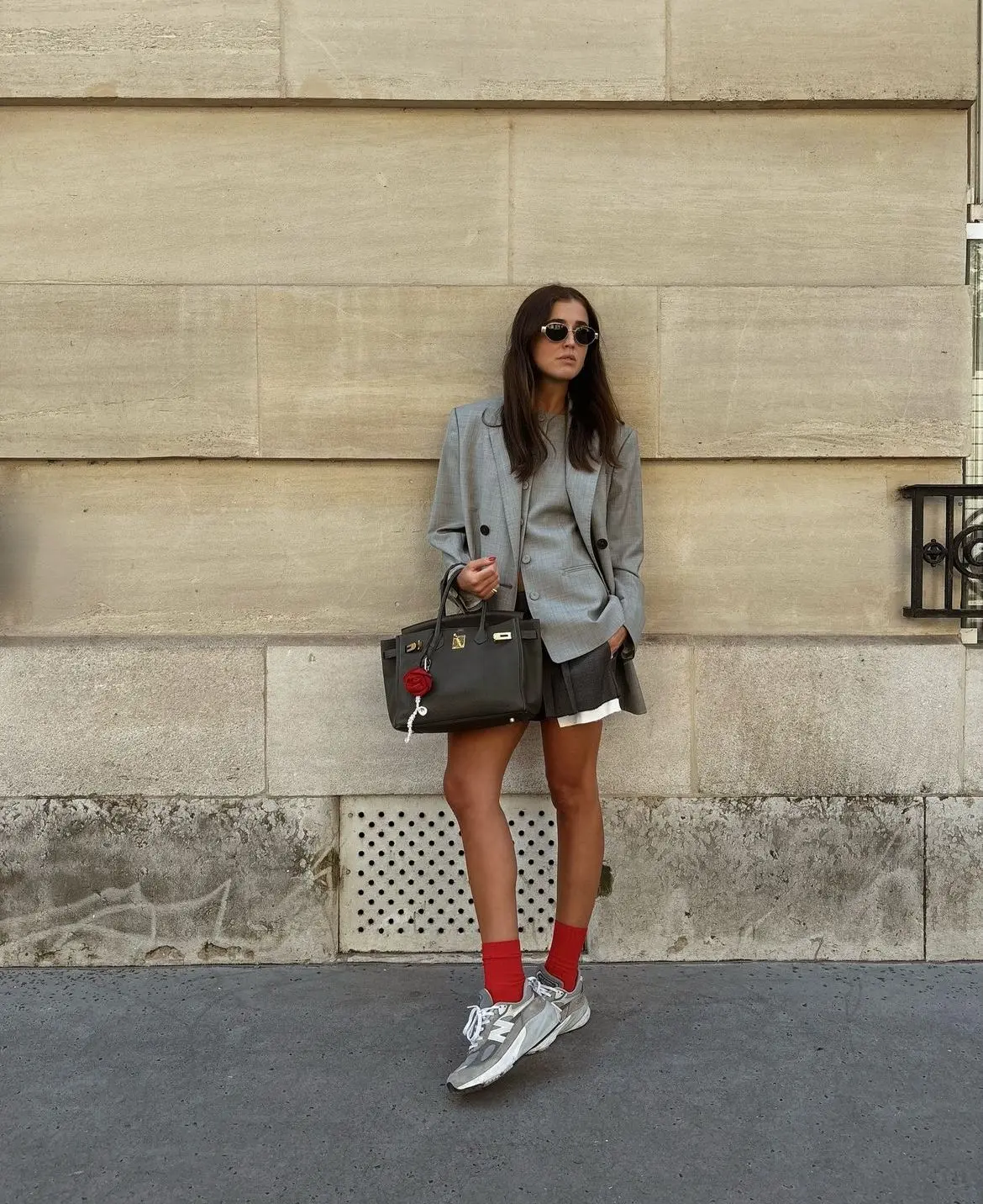 Who says blazers have to be boring? An oversized gray blazer paired with crisp shorts creates this perfectly balanced mix of polished and playful. The real styling trick here is the pop of color from your socks—red, yellow, or even bright blue adds personality. Finish with sneakers New Balance 9060 for a look that works for weekend brunch or casual daytime events.