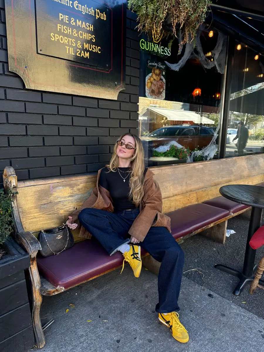 When you want to add a bit of edge to your sneaker outfit, a suede bomber jacket is the answer. Layer it over a fitted black turtleneck and dark straight-leg jeans for a sleek silhouette. Yellow or mustard sneakers become the unexpected statement piece that elevates the whole look. This works beautifully for casual evening plans or day-to-night transitions.