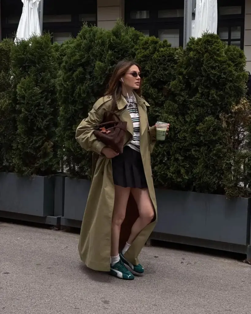 There’s something so chic about pairing athletic shoes with feminine pieces. A classic khaki trench coat over a striped top and black pleated mini skirt creates visual interest and contrast. White socks and green Puma Speedcat add that cool, sporty touch that makes the outfit feel modern rather than too dressy. This is ideal for unpredictable spring weather when you need a versatile layer.