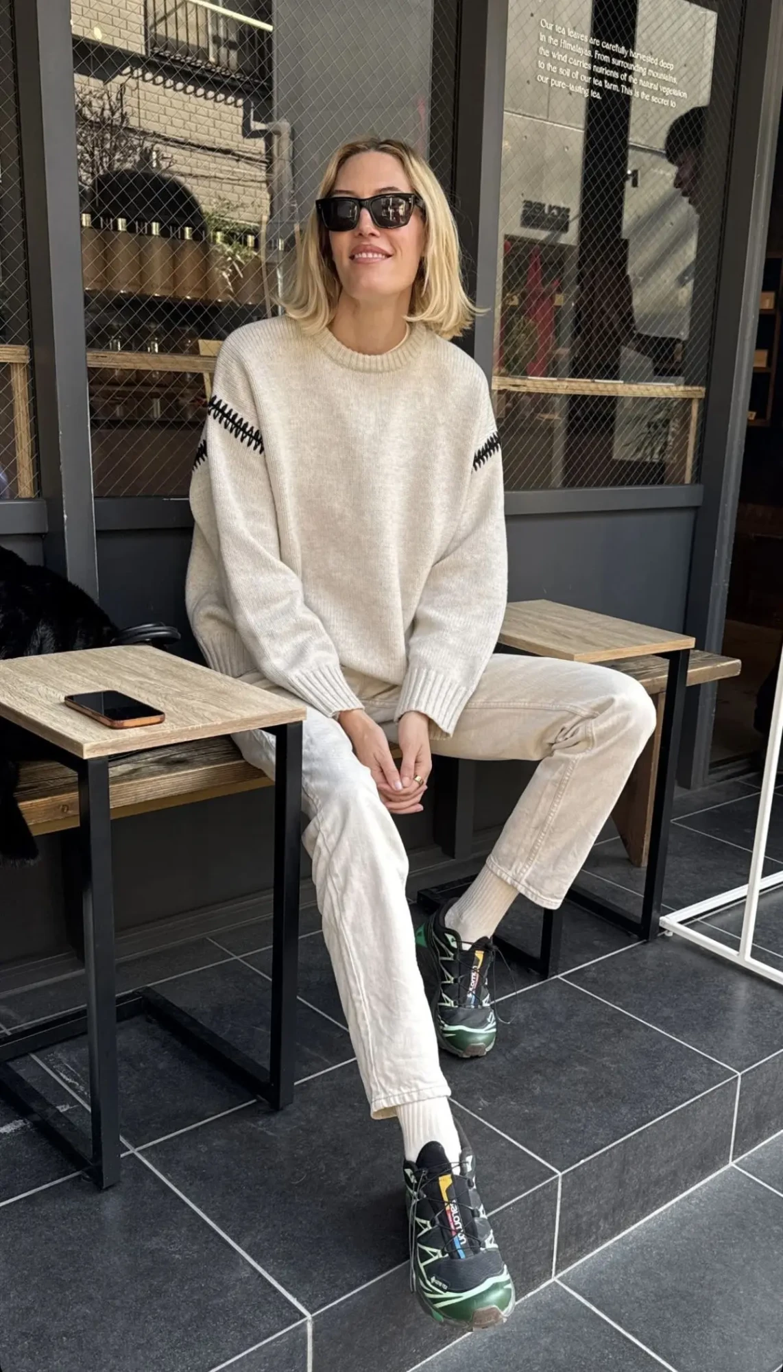 7. Cream sweater with contrasting sleeve detail + light wash jeans + sneakers Salomon