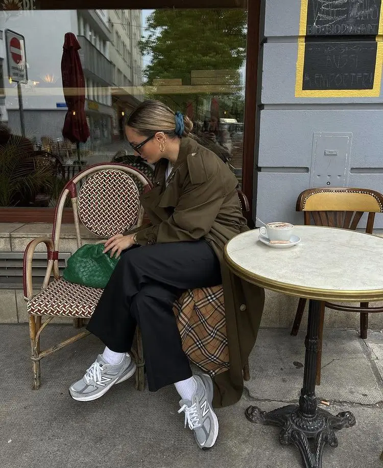 8. Olive shirt + black wide-leg pants + white crew socks + sneakers New Balance 990