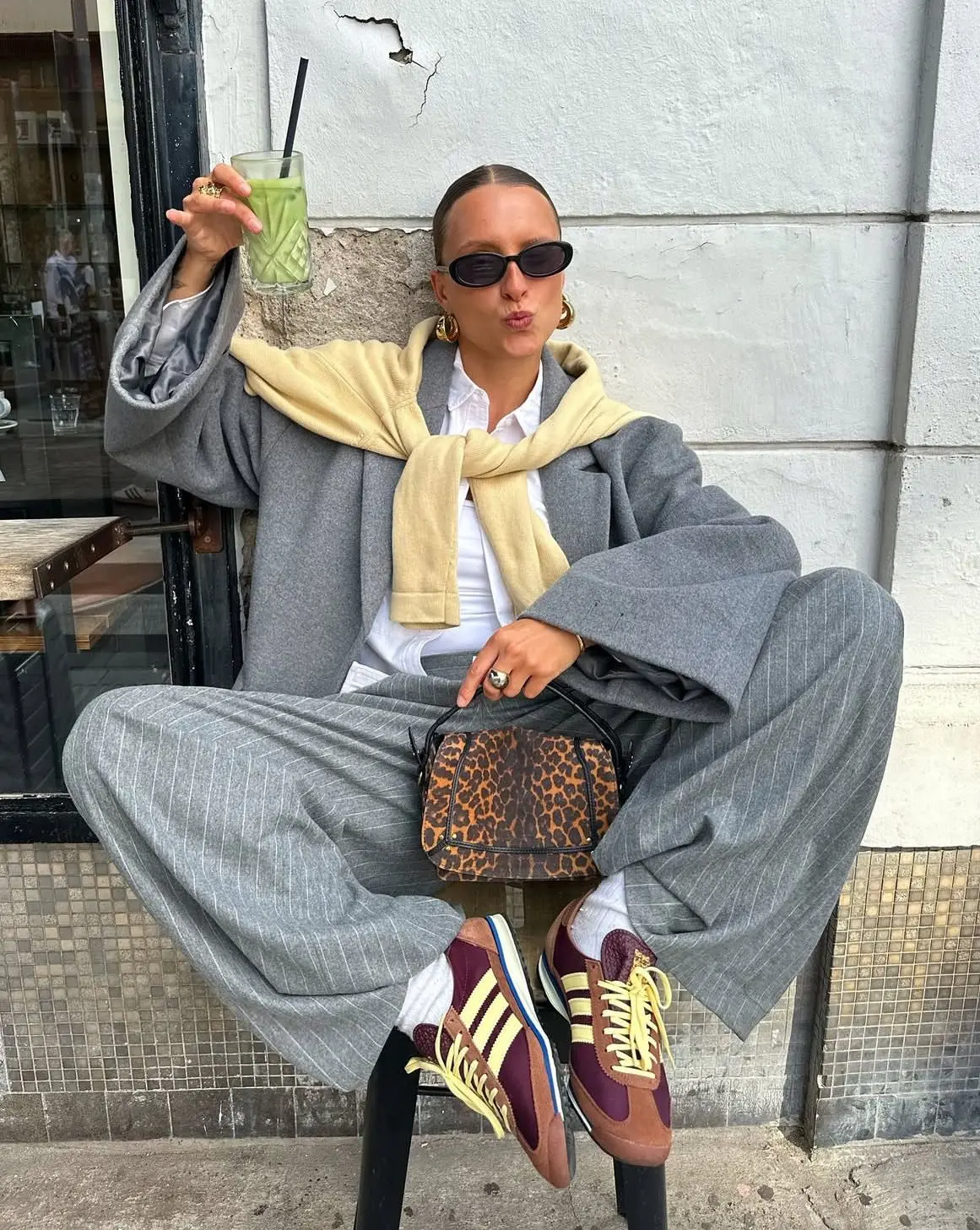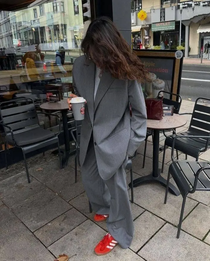 This is proof that sneakers can absolutely work in more polished settings. A gray pinstripe suit feels professional and put-together, but swapping heels for bold red sneakers Adidas Samba suddenly makes the whole outfit feel modern and confident. The unexpected pop of color shows you know exactly what you’re doing style-wise. Add a structured bag to complete the look.