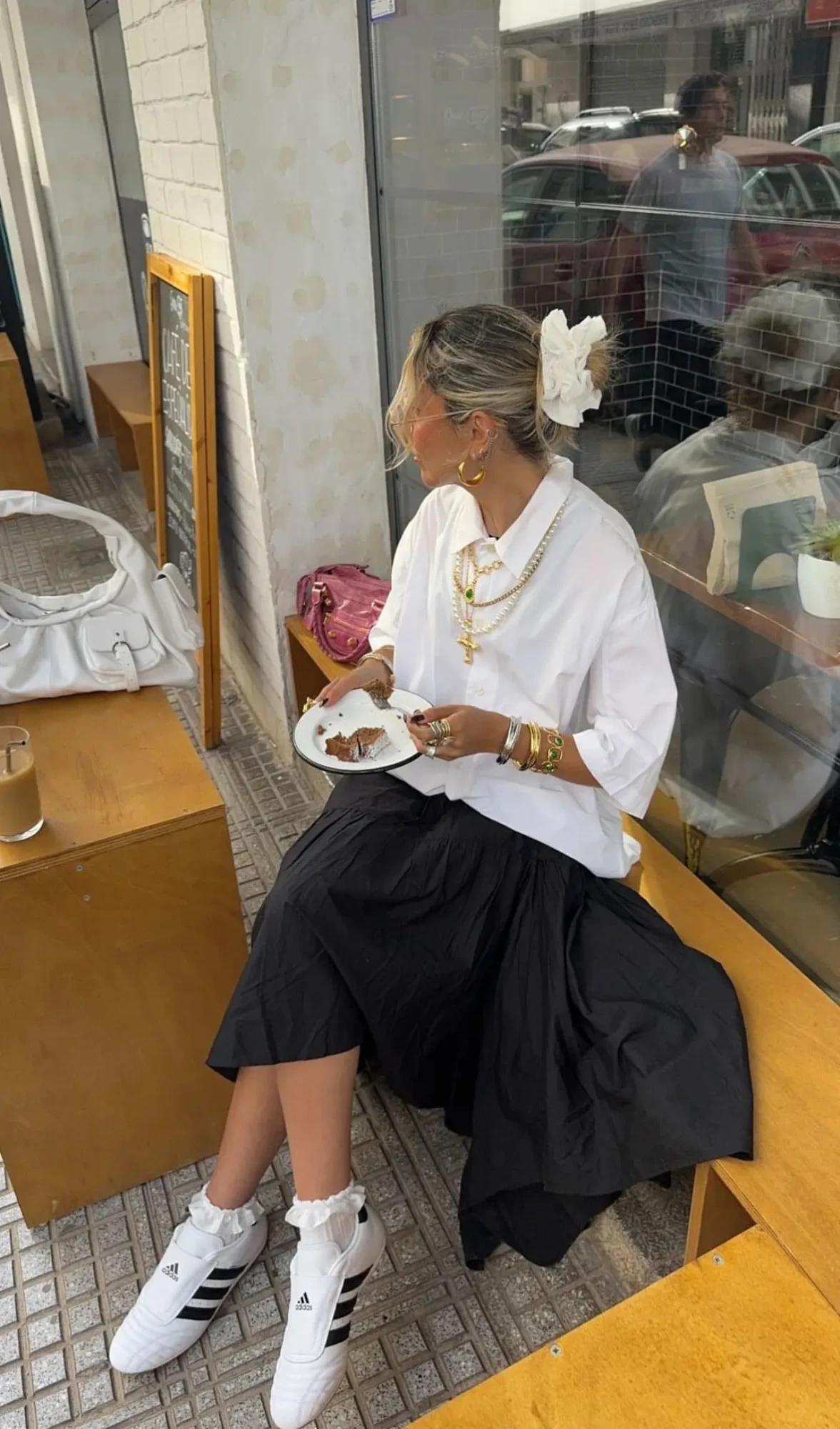 A crisp white button-down is a wardrobe workhorse, especially when styled with a flowing black pleated midi skirt. The contrast between the structured shirt and feminine skirt creates beautiful balance. Layer on chunky gold jewelry and add Adidas Originals Taekwondo for a look that feels both elegant and approachable. A white flower hair clip adds an unexpectedly sweet touch.