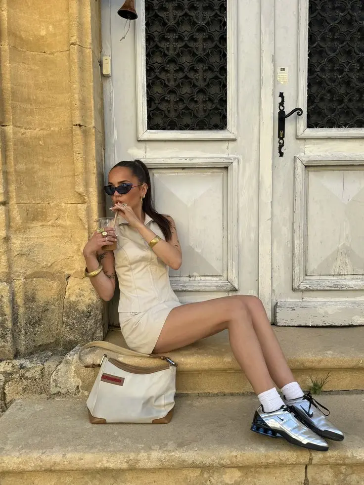 Mini dresses and sneakers are a match made in spring heaven. A simple cream-colored mini dress becomes instantly cooler when paired with metallic sneakers Nike Total 90 and white crew socks. Add dark sunglasses and a vintage-inspired cream bag for a look that works for daytime events, outdoor concerts, or exploring a new neighborhood. It’s effortless in the best possible way.