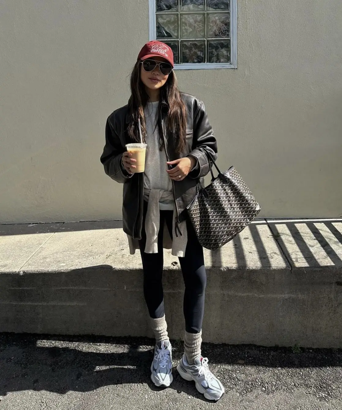 13. Oversized leather jacket + gray sweat set + baseball cap + sneakers New Balance 530