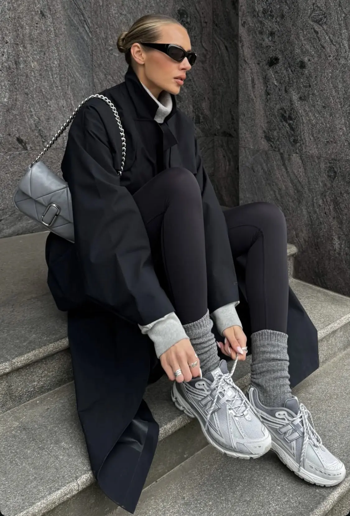 When you want to look sleek and monochromatic, an all-black outfit creates the perfect canvas for interesting styling details. Layer a fitted gray turtleneck under a black oversized coat, then add black leggings or slim trousers. Gray leg warmers over your sneakers add texture and a sporty-chic element that feels very now. Metallic silver sneakers provide just enough contrast to keep things from feeling too heavy.
