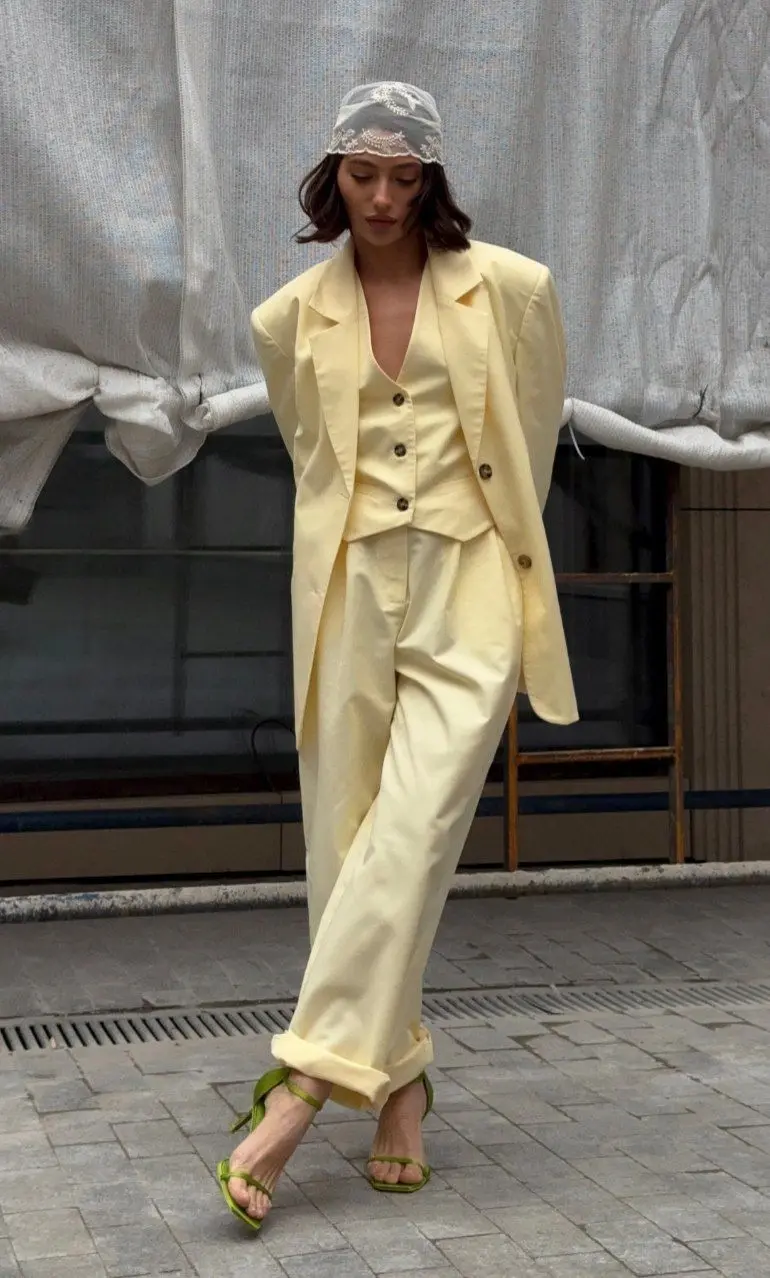 Okay, this one requires confidence, but if you’re ready to fully commit to a look, this butter yellow three-piece situation is stunning. The matching blazer, vest, and wide-leg trousers create a cohesive, fashion-forward outfit that feels both retro and completely modern.