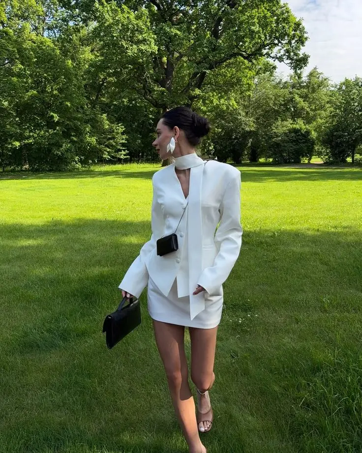 Here’s proof that you don’t need trousers to create a powerful suit moment. This crisp white blazer paired with a coordinating mini skirt offers a fresh, feminine take on traditional suiting that’s perfect for spring and summer occasions.