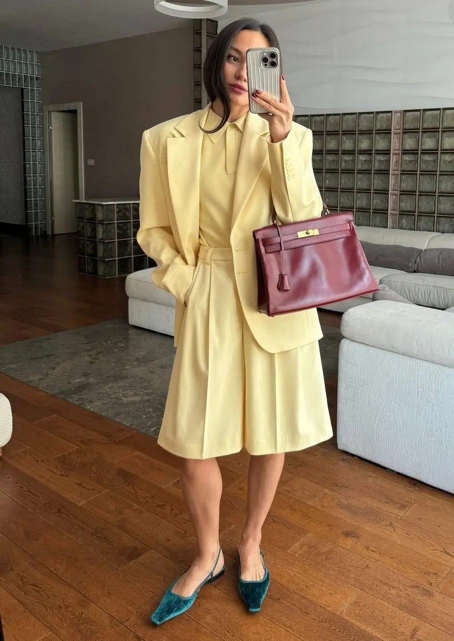 This is what happens when suiting gets a playful summer upgrade. The butter yellow blazer paired with matching bermuda shorts and a coordinating tie-waist top creates a fresh, modern take on professional dressing that’s perfect for warmer months.