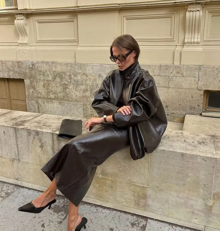 Styling Tips: Leather can be tricky—the key is keeping the fit relaxed rather than body-con. This outfit works for cooler fall and winter days, evening events, fashion-forward workplaces, or date nights. You can also break up the set: wear the leather trousers with a chunky knit sweater, or pair the shirt with jeans. Just avoid wearing this in very hot weather—leather isn’t breathable and you’ll be uncomfortable.
