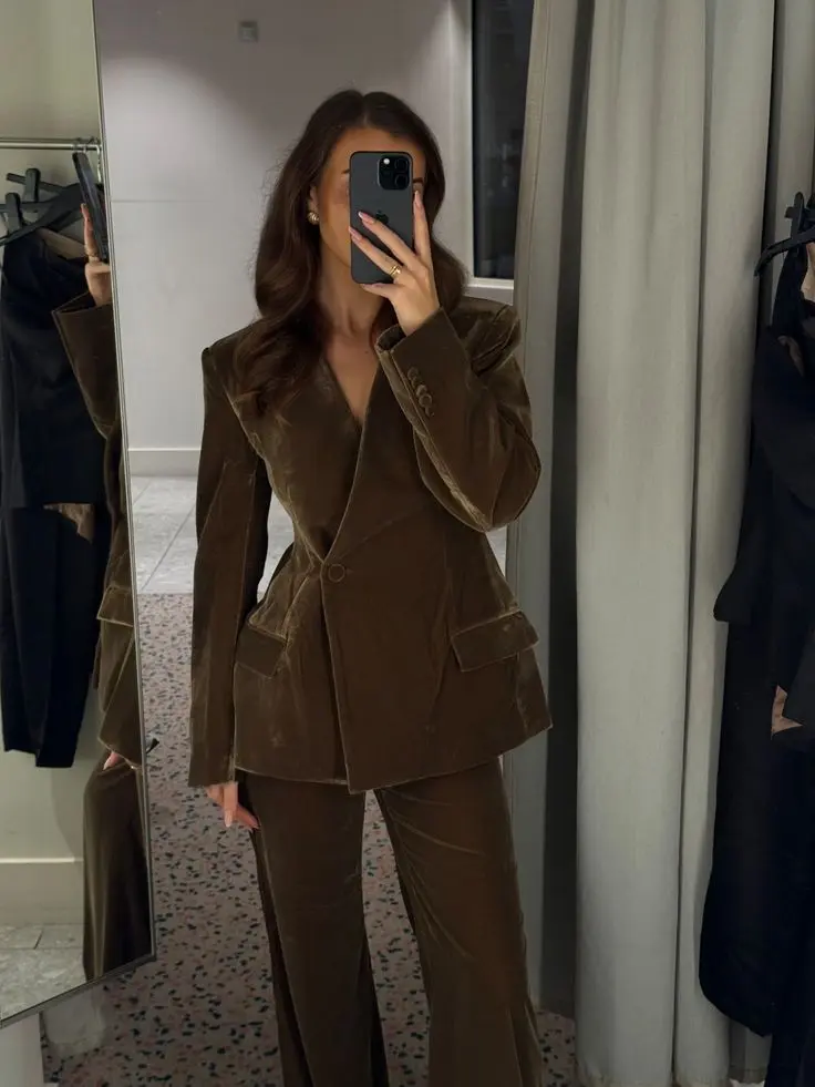 Velvet adds instant richness to any outfit, and this olive-toned velvet suit is proof. The structured blazer and matching trousers create a luxurious look that’s perfect for fall and winter occasions when you want something special but not overly formal.