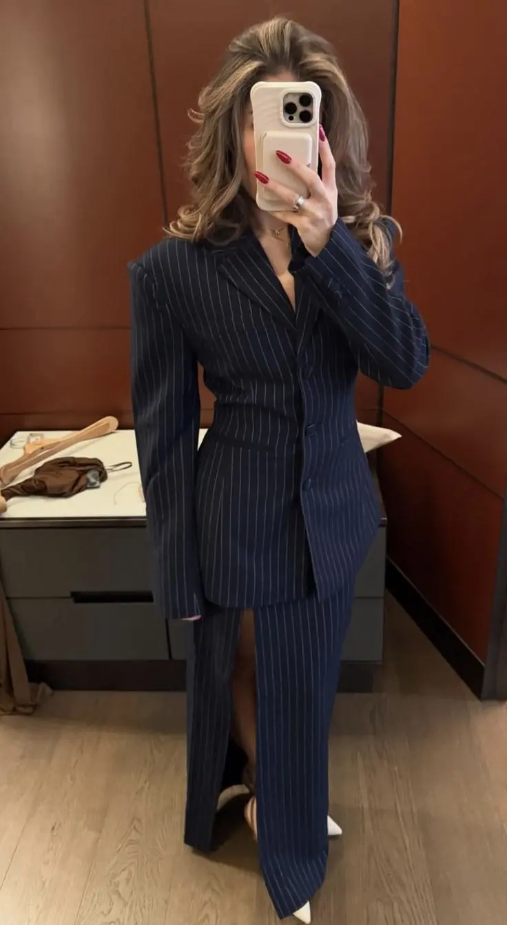 Pinstripes are having their moment again, and this charcoal gray suit proves exactly why they never really go out of style. The matching blazer and wide-leg trousers create a cohesive, polished look that somehow feels both professional and effortlessly cool at the same time.
