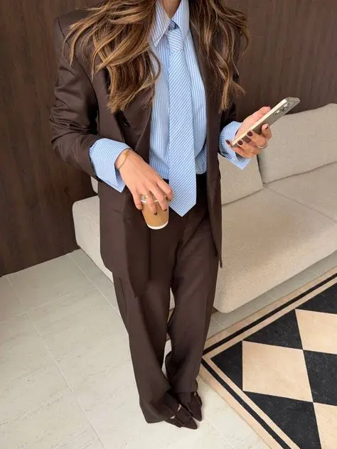 Styling Tips: The striped shirt is what makes this outfit special—it shows thoughtfulness and personal style. This combination works for business casual settings, creative industries, or anywhere you want to look professional but not stuffy. The key is ensuring your shirt pattern isn’t too bold or busy—subtle stripes or small checks work best. Brown shoes (whether loafers, oxfords, or ankle boots) complete the monochrome moment beautifully.
