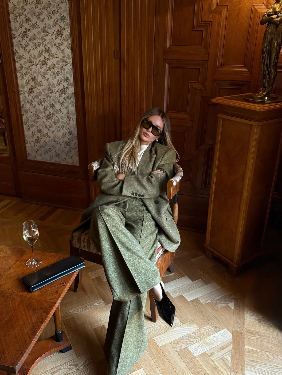 Sometimes a suit is really a matching coat and trouser set, and this olive green combination is stunning. The oversized blazer creates dramatic proportions, while the matching trousers ground the look.