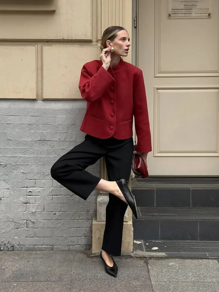 This rich red blazer paired with tailored black pants proves that business formal doesn’t mean playing it safe with neutrals. The structured silhouette and quality tailoring keep it professional, while the bold color communicates confidence. The matching burgundy bag creates a cohesive color story that feels intentional rather than matchy-matchy.
