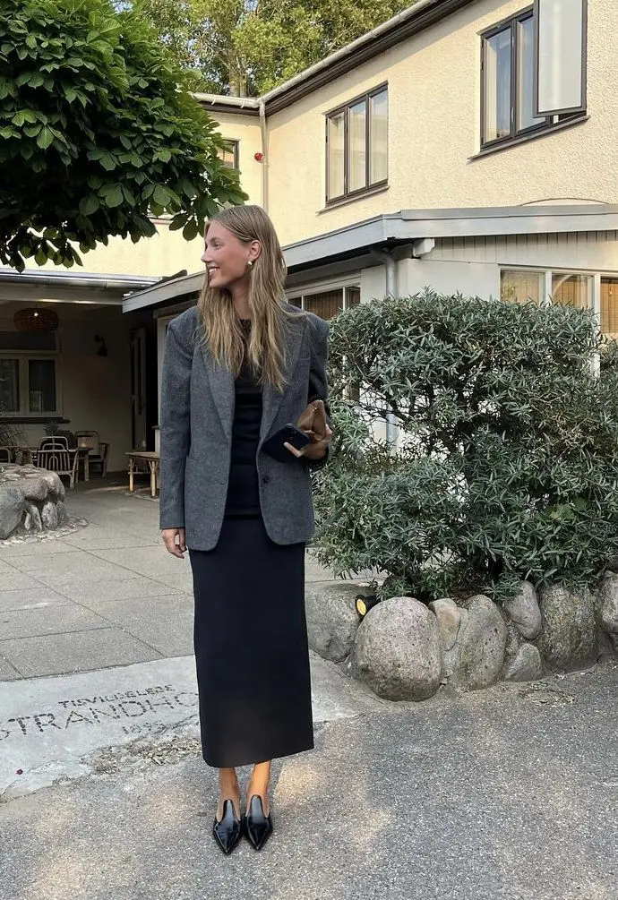 This combination is what I call “effortlessly authoritative.” The charcoal grey blazer offers a softer alternative to black while maintaining professionalism. Paired with a black midi skirt and pointed-toe heels, it creates an elegant silhouette that’s perfect for high-stakes meetings or formal presentations.