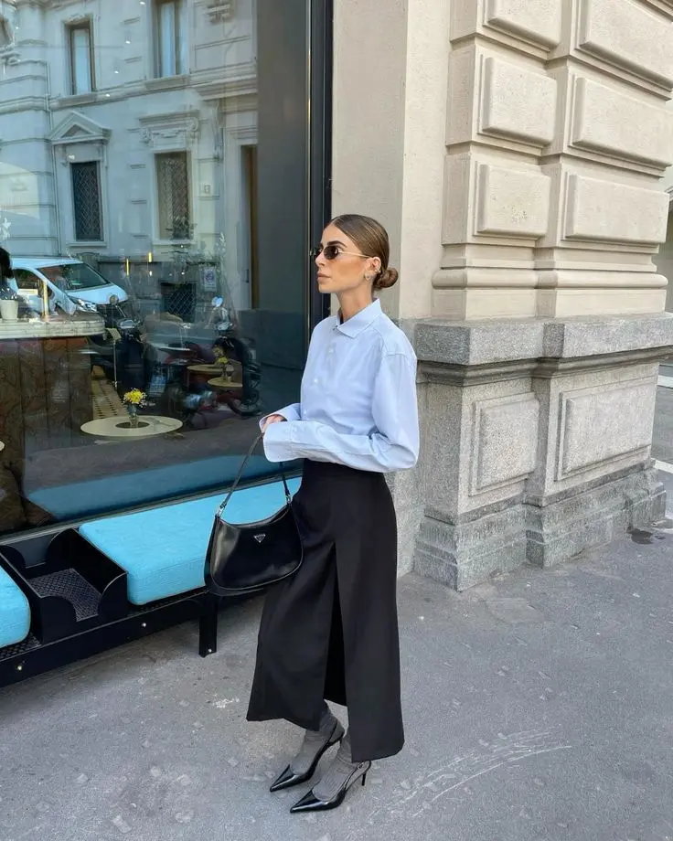 The crisp light blue button-down with a black midi skirt is a master class in cleanliness and modern professionalism. The slight color contrast keeps it from feeling too stark, while the wide-leg silhouette feels current without being trendy.