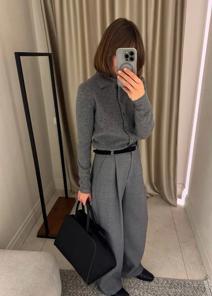 This head-to-toe grey ensemble (grey sweater with grey tailored pants) exemplifies the power of tonal dressing in professional contexts. Monochromatic outfits create a long, unbroken line that looks incredibly sophisticated, and grey is particularly versatile for business settings.