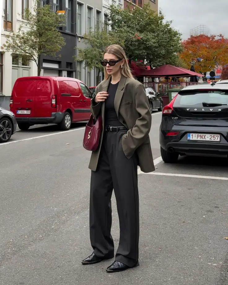 This olive or khaki-toned blazer with black pants and a burgundy bag demonstrates how to incorporate earthy tones into business formal. The color feels fresh and modern while maintaining authority. The structured blazer keeps it professional, while the color choice shows personality.