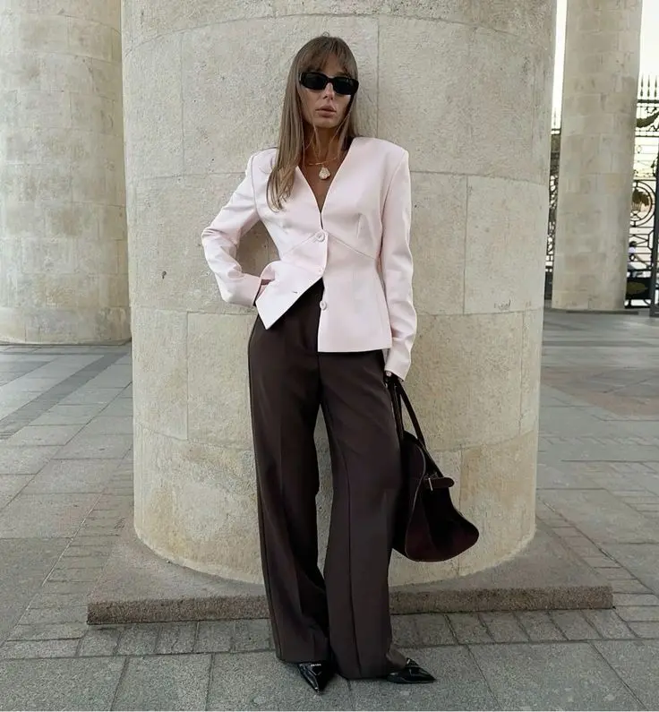 8. Pale Pink Blazer with Chocolate Brown Pants
