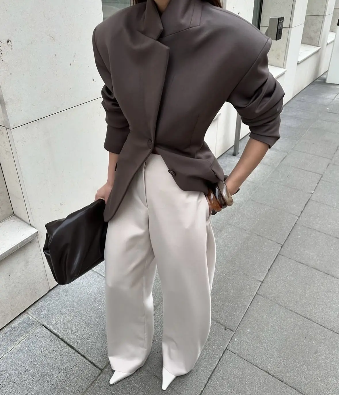 Styling tip: Neutral-on-neutral combinations work when you vary the shades slightly—here, the taupe and cream create visual interest without high contrast. The wide-leg pants give the outfit a modern edge, while the structured blazer keeps it boardroom-appropriate. This is perfect for industries where you want to appear polished but not overly corporate. The black clutch adds necessary contrast and definition.