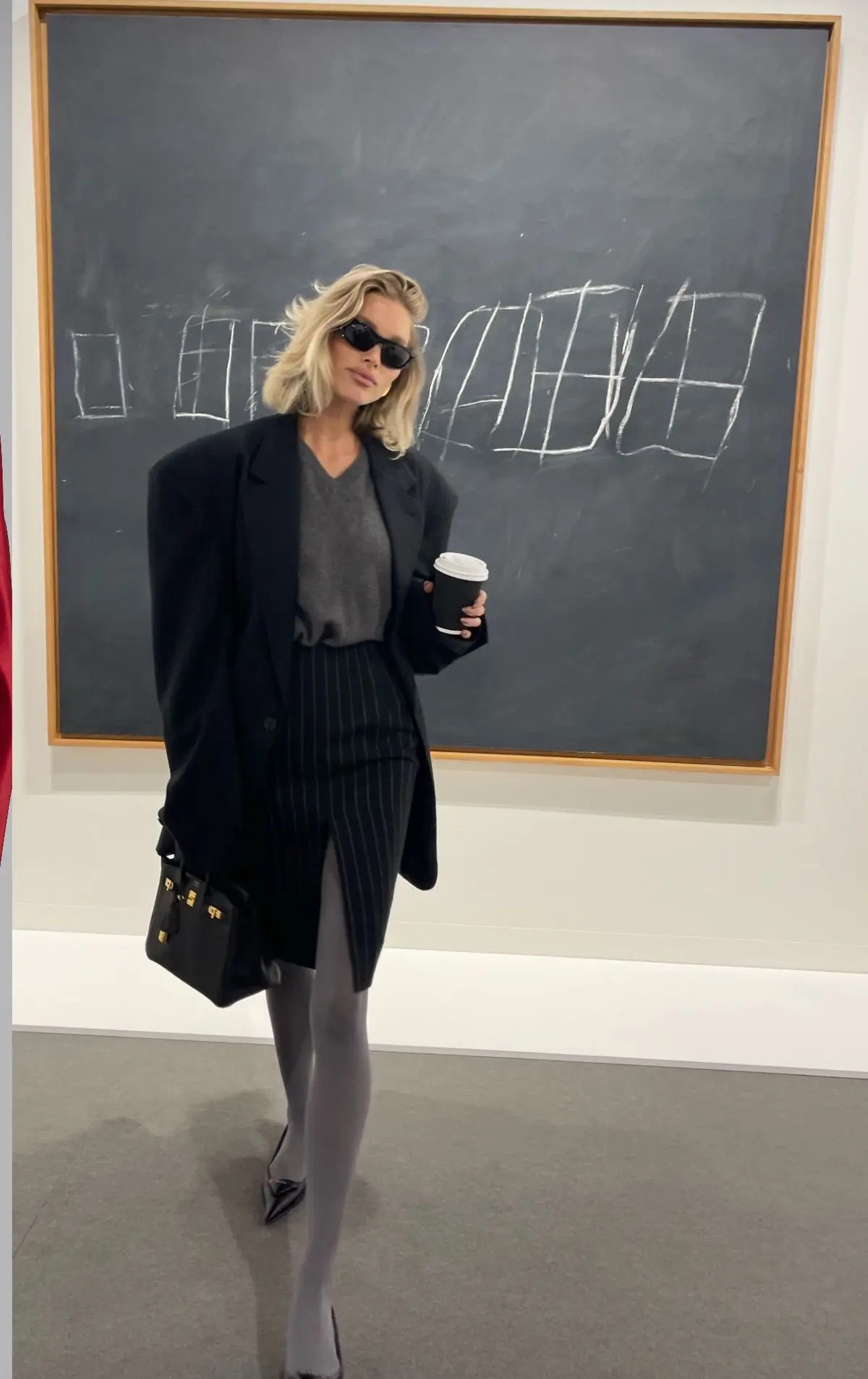 The black blazer with grey pinstripe midi skirt is classic corporate dressing done right. Pinstripes have long been associated with business attire, and this subtle version feels traditional without being dated.