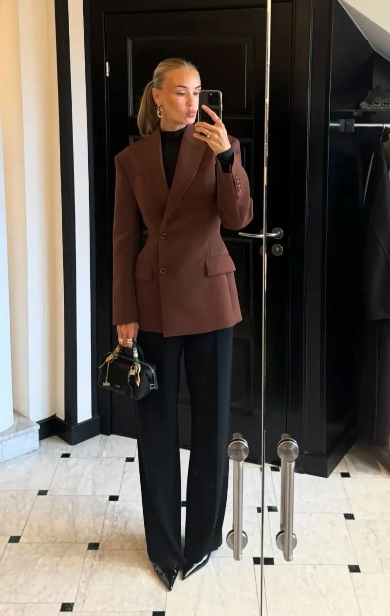 Styling tip: Chocolate brown pairs beautifully with black—the combination feels rich and intentional rather than mismatched. The turtleneck adds an extra layer of polish under the blazer, and the black structured bag keeps everything cohesive. This color combination is particularly stunning in fall and winter but works year-round in quality fabrics. The wide-leg pants give it a contemporary edge that prevents the outfit from feeling dated.